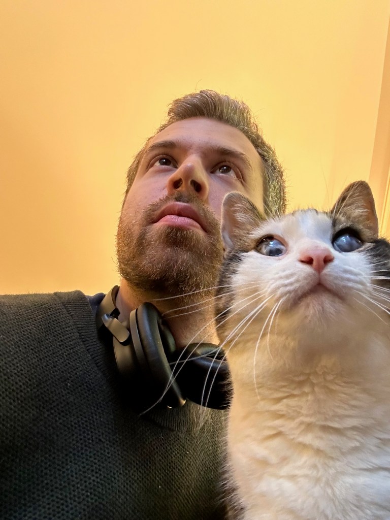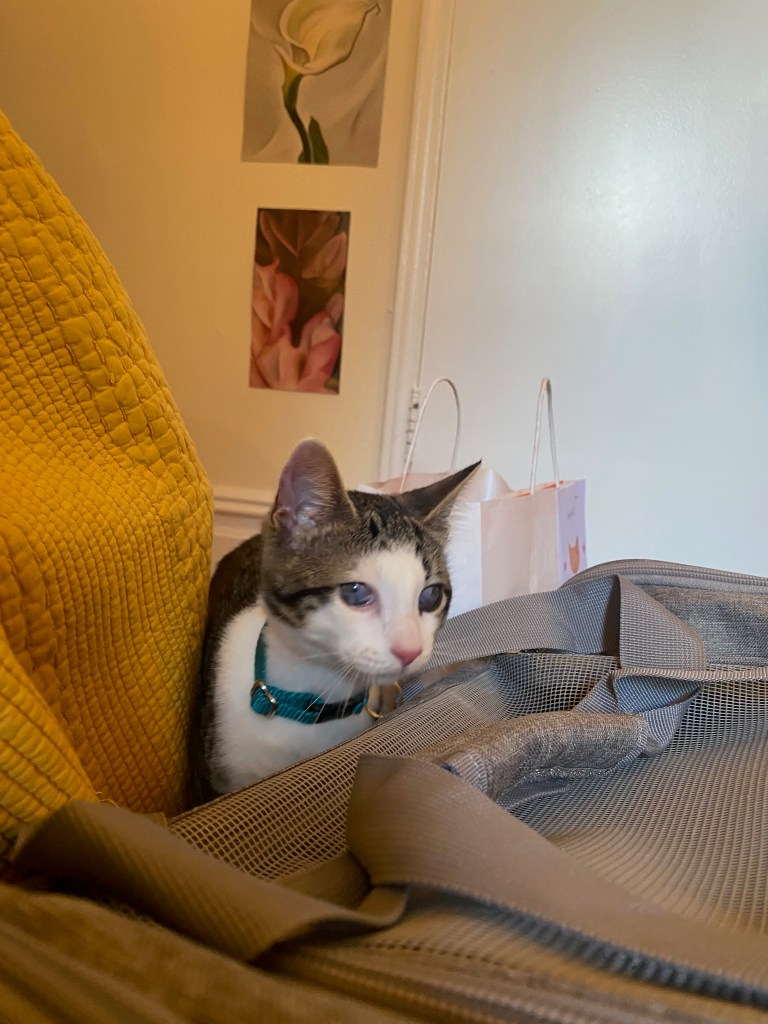 The first thing anyone ever notices about Franklin is his eyes. They’re the first thing we noticed too when we went to the ASPCA shelter in August 2022 to look for a kitten. The shelter showed us him first but warned us that he had had an infection after he was born that left some scarring on his eyes but that he could still see. I think they were worried no one would want to adopt him because Franklin looks a little scary at first sight. He doesn’t always move his eyes and when he looks at you his eyes seem like crazy marbles.