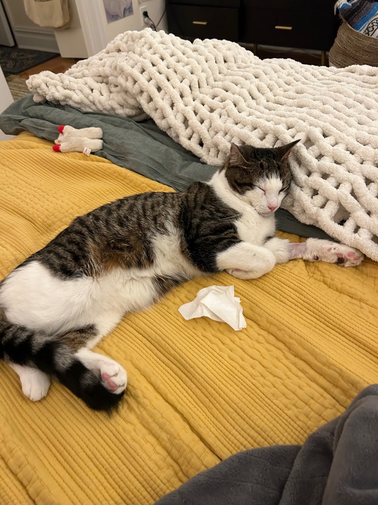 Franklin got all snuggled up after the first time he got sick and he came home from the vet with his paw all shaved: