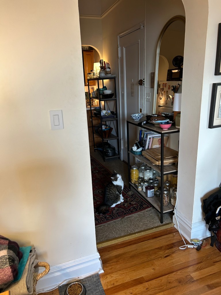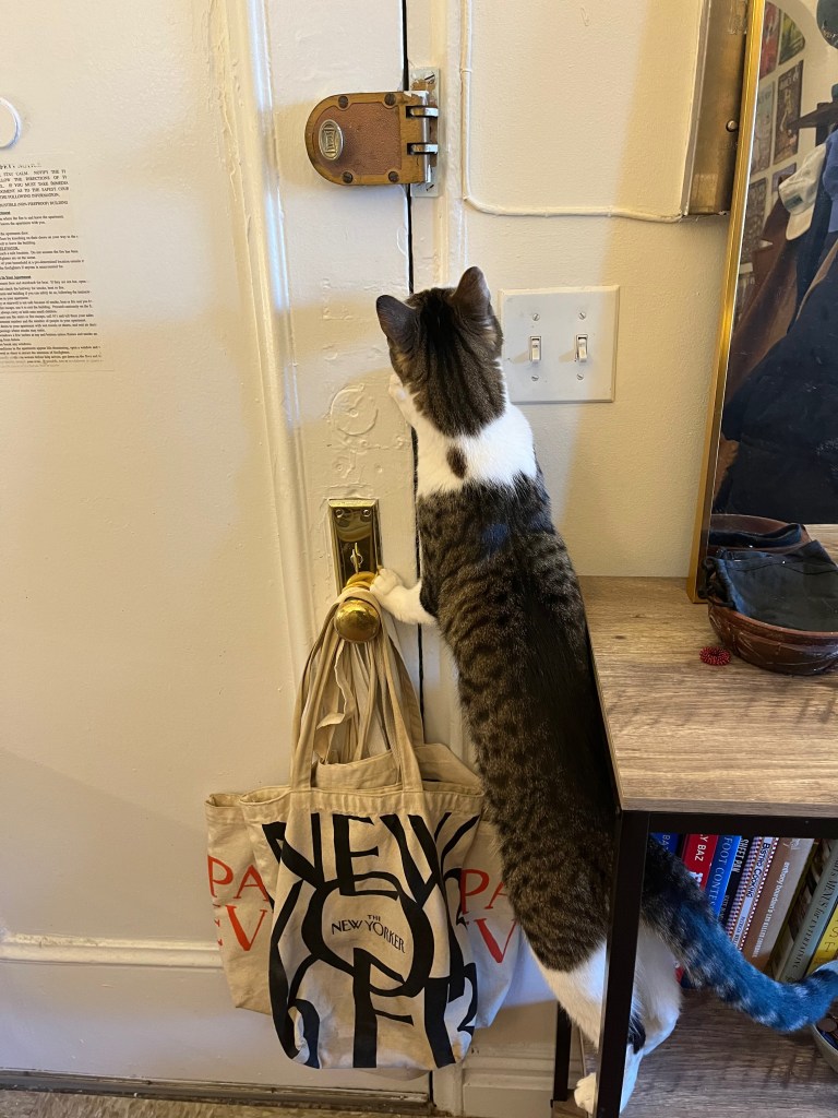 The problem was that Franklin started wanting his hall time pretty frequently and also started trying to get a quick run in whenever we came in or left the apartment. As a result we usually had to juggle him, especially when we were bringing in something big.
