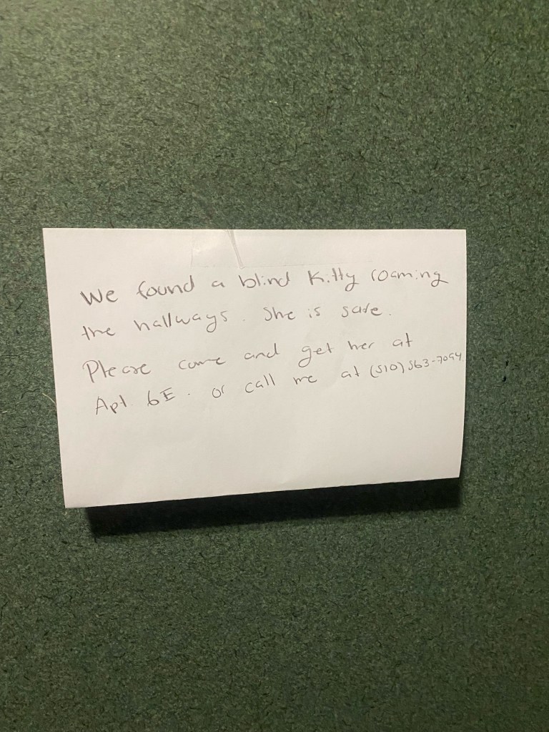 One time, I came back into the apartment and noticed that I didn’t see Franklin. I’d gone out earlier but thought he was napping at the time. But then Anna saw a note in our elevator saying that a “Blind kitty” had been found wandering around the 6th floor! “She” was still in the person’s apartment and it turned out Franklin had snuck out and somehow gotten all the way up two flights of stairs! Funnily enough, her apartment was at the same place in the hallway as ours. Franklin did know his way back but being blind, couldn’t read the floor numbers.