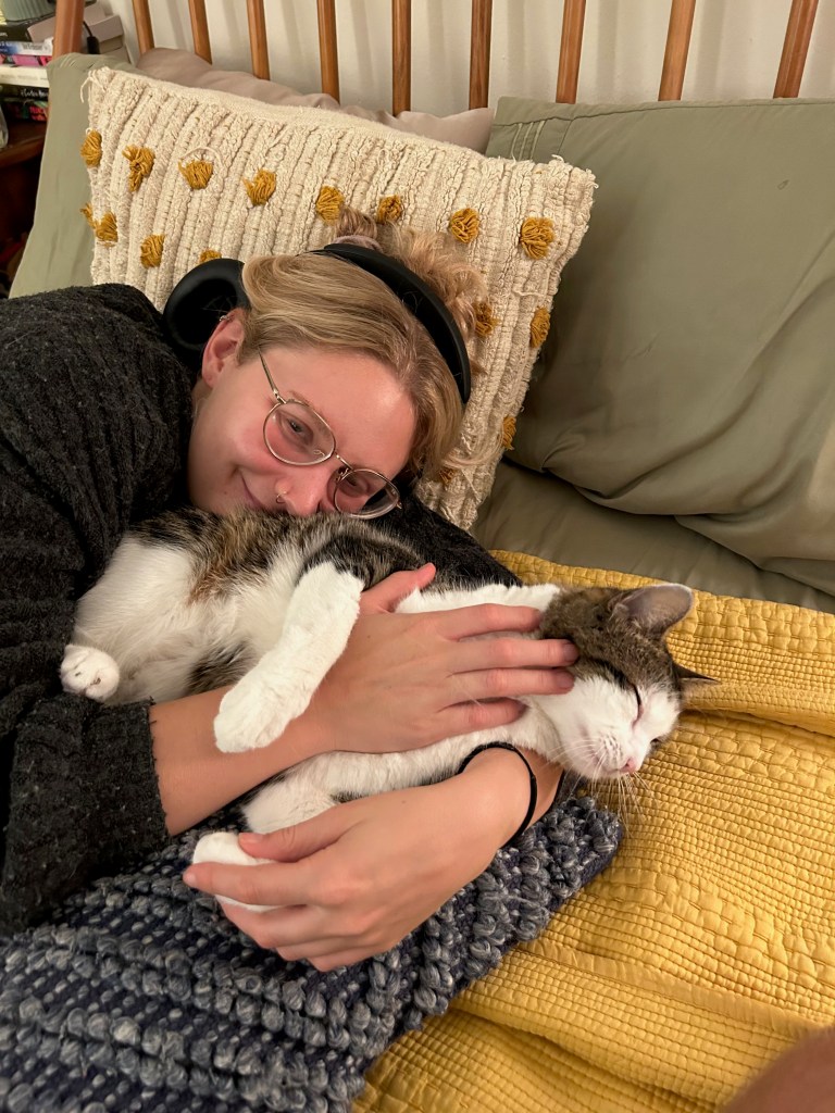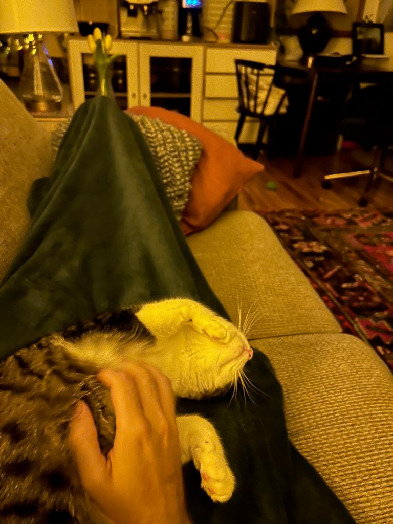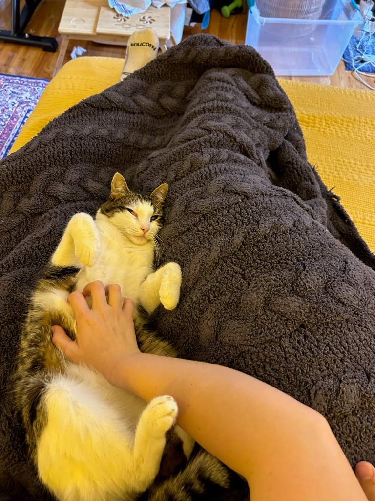 And this was entirely on Franklin’s terms. Sometimes he would do it just for a bit. Other times he wanted all the attention for like half an hour. Usually the best time was either in the evening as we were getting in bed or in the morning if we were sitting on the couch with a blanket over our laps. You see, Franklin liked do his belly rubs on a comfy blanket. But Franklin would do a belly rub during the daytime especially if one of us was lying in bed, so he absolutely loved if someone was sick because it meant more belly time. Once when I couldn’t sleep and was sitting out on our couch in the living room, he came and we did a belly rub.