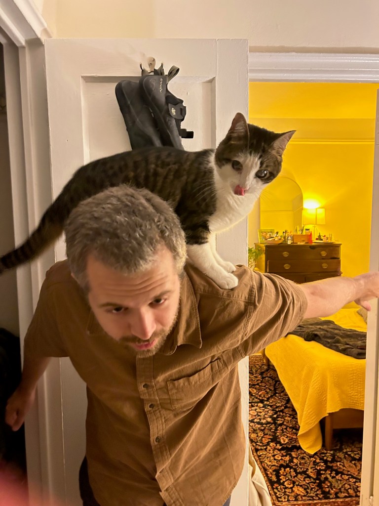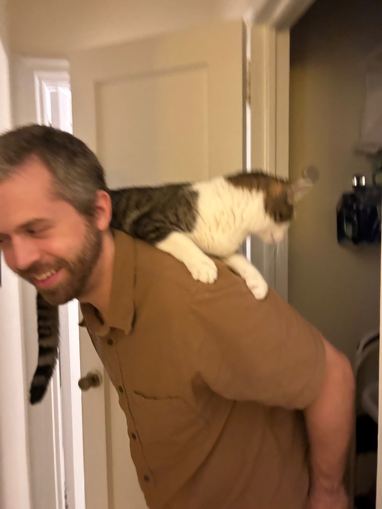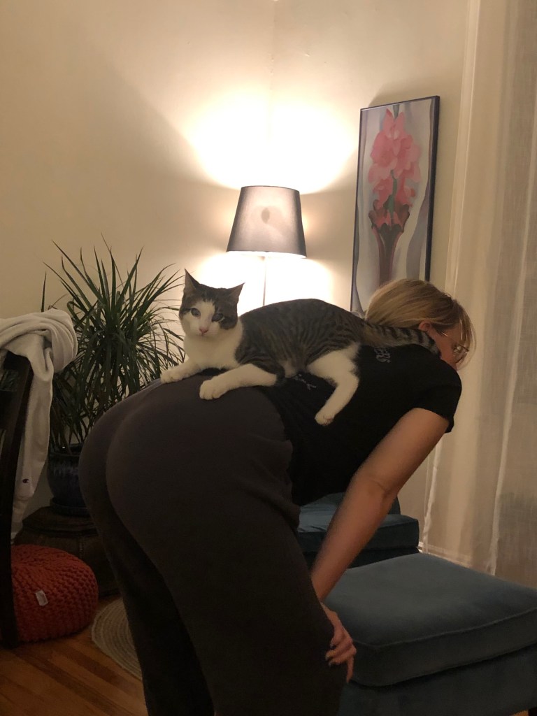 Sometimes he’d use this more as a step down to the ground. Franklin never liked jumping down from too high, a consequence of being kind of blind. But often he’d just settle down and chill for a bit on our backs, enjoying a new surface and the view. There was one time he was on Anna’s back for a solid 15 minutes after which he decided enough was enough and leapt down.